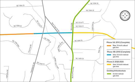 Construction of 2.8 miles of 16-inch natural gas pipeline along the existing SPU utility corridor, between Mink Rd NE and 155th Ave NE. This phase began construction in 2015. Construction of the remaining 1,800 feet commenced in June 2018. - Phase 2