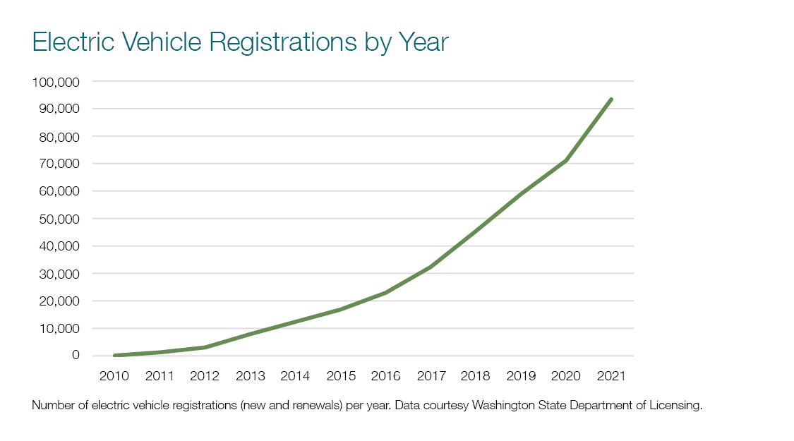 至关重要。我们相信电力是未来的交通燃料。华盛顿州的电动汽车拥有量持续增长,许可部追踪新电动汽车注册量和道路上注册电动汽车总数的数据显示。随着该州计划到2035年禁止销售新的汽油动力汽车,这一数字应该会增加。随着华盛顿州努力根据 CETA到2045年提供100%的清洁电力,这些电动汽车将越来越多地使用清洁能源。通过创新和客户伙伴关系,我们正在共同努力建设一个为子孙后代服务的能源未来。